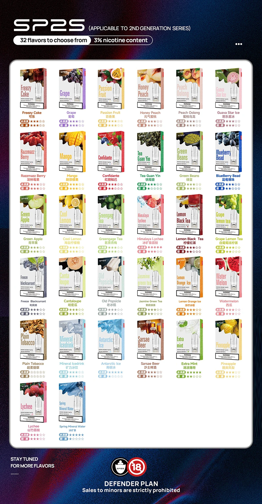 - 極致口感:SP2煙彈口味多達33種,是對極致口感的追求。